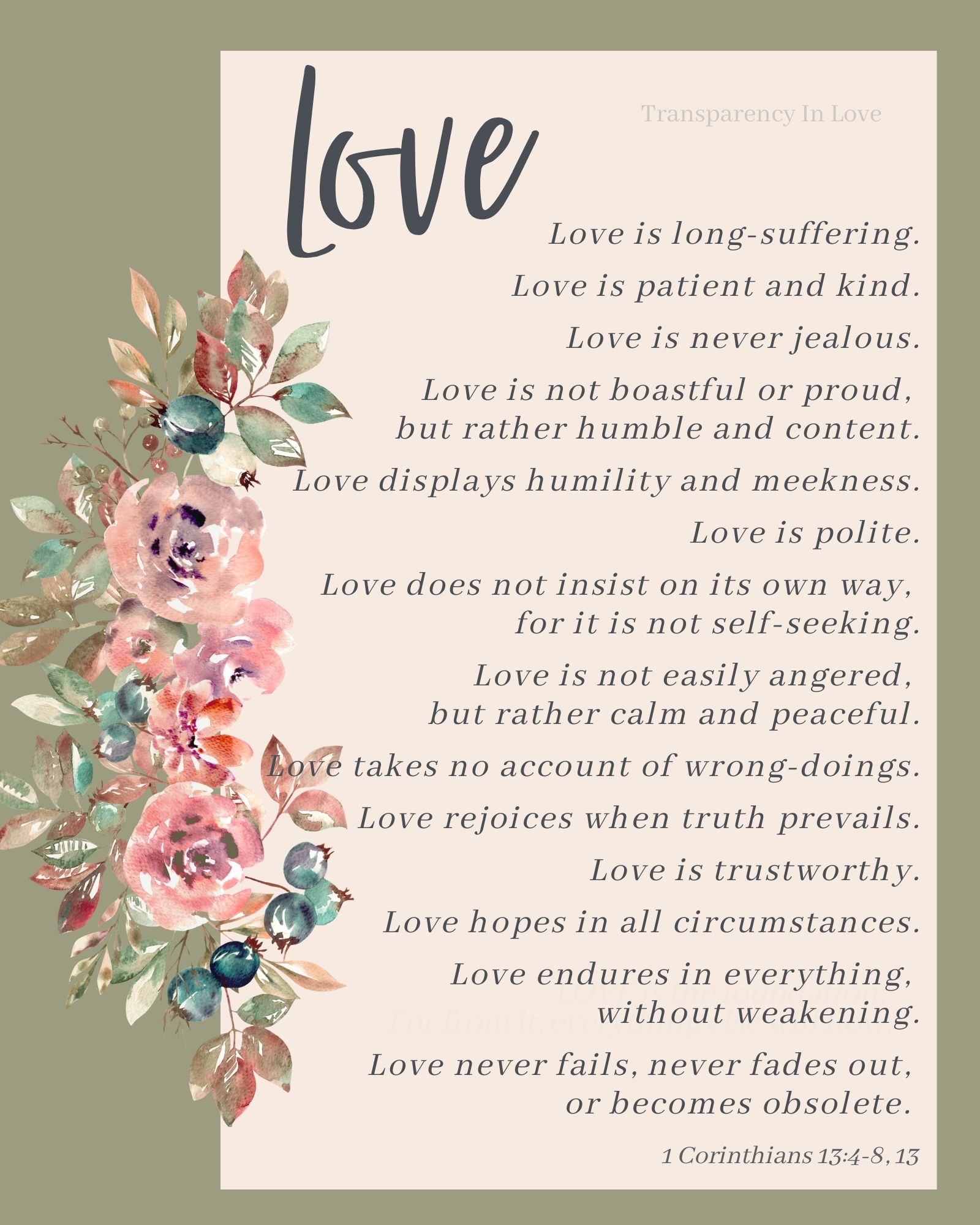 If you’re a regular reader of Transparency in Love, you may have discovered, I love reading scripture in multiple versions, particularly AMPC and NIV, and this passage in AMPC is so good. It reads, with more detail, “Love endures long and is patient and kind; love never is envious nor boils over with jealousy, it is not boastful or vainglorious, does not display itself haughtily. It is not conceited (arrogant and inflated with pride); it is not rude (unmannerly) and does not act unbecomingly. Love (God’s love in us) does not insist on its own rights or its own way, for it is not self-seeking; it is not touchy or fretful or resentful; it takes no account of the evil done to it [it pays no attention to a suffered wrong]. It does not rejoice at injustice and unrighteousness, but rejoices when right and truth prevail. Love bears up under anything and everything that comes, is ever ready to believe the best of every person, it hopes are fadeless under all circumstances, and it endures everything [without weakening]. Love never fails [never fades out or becomes obsolete or comes to an end].”